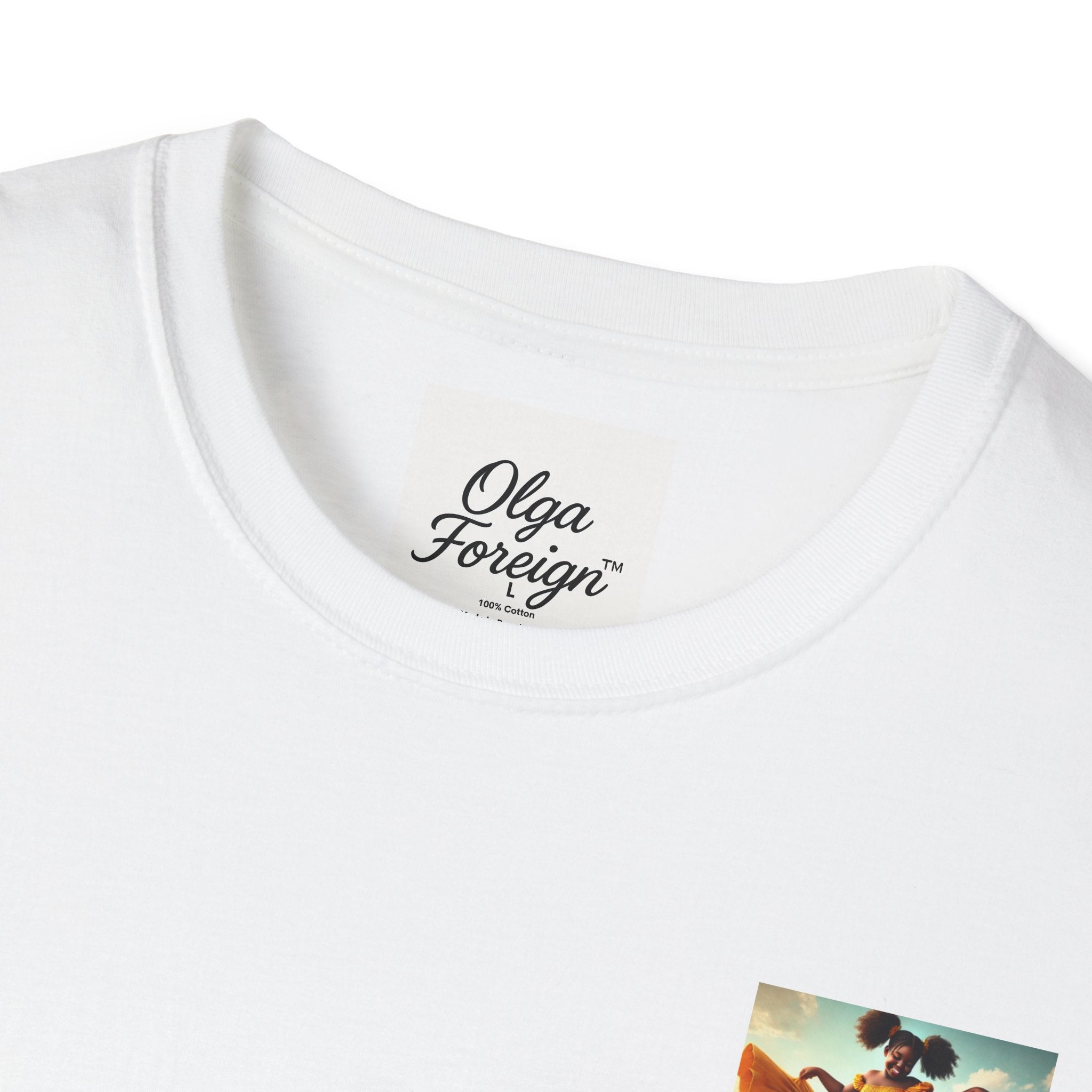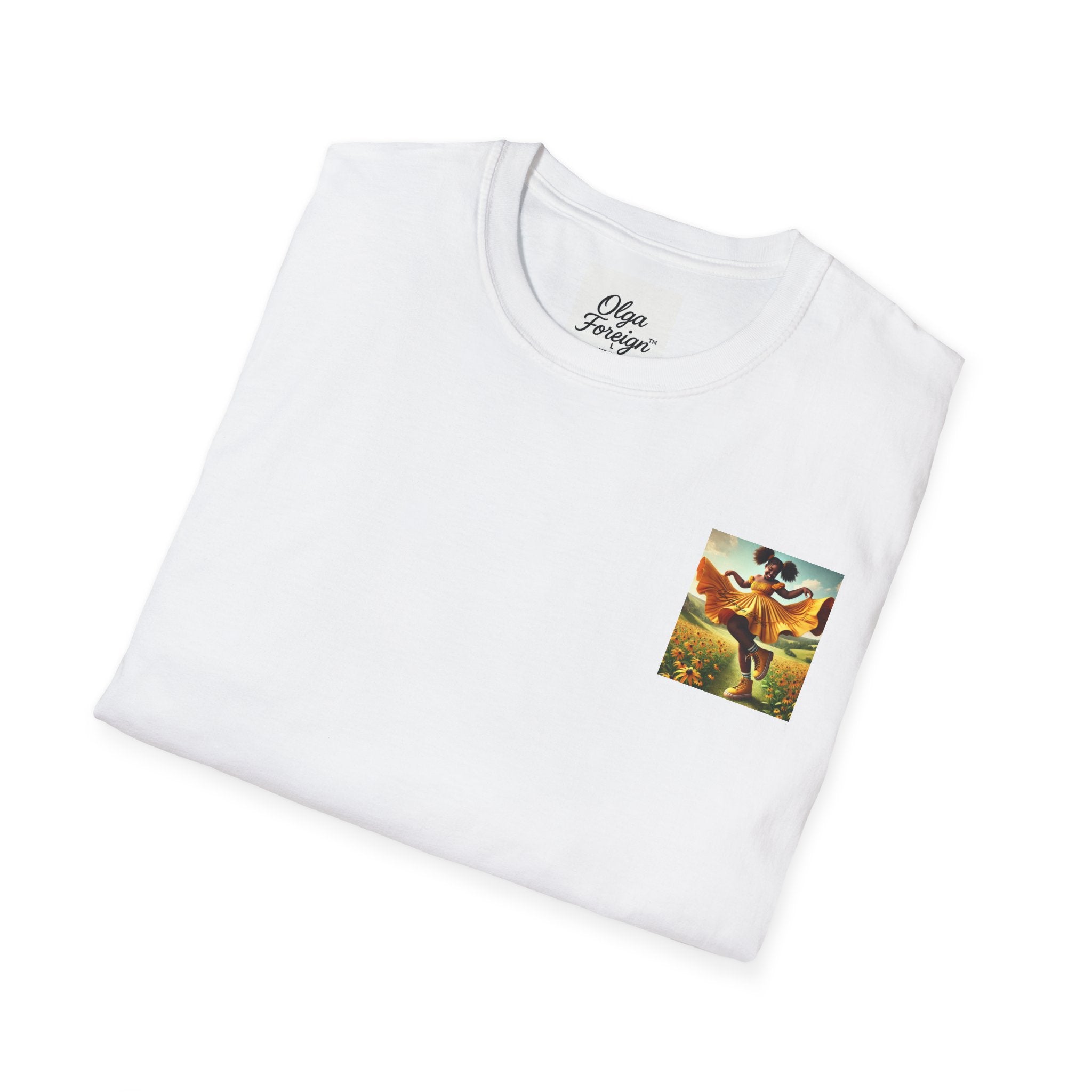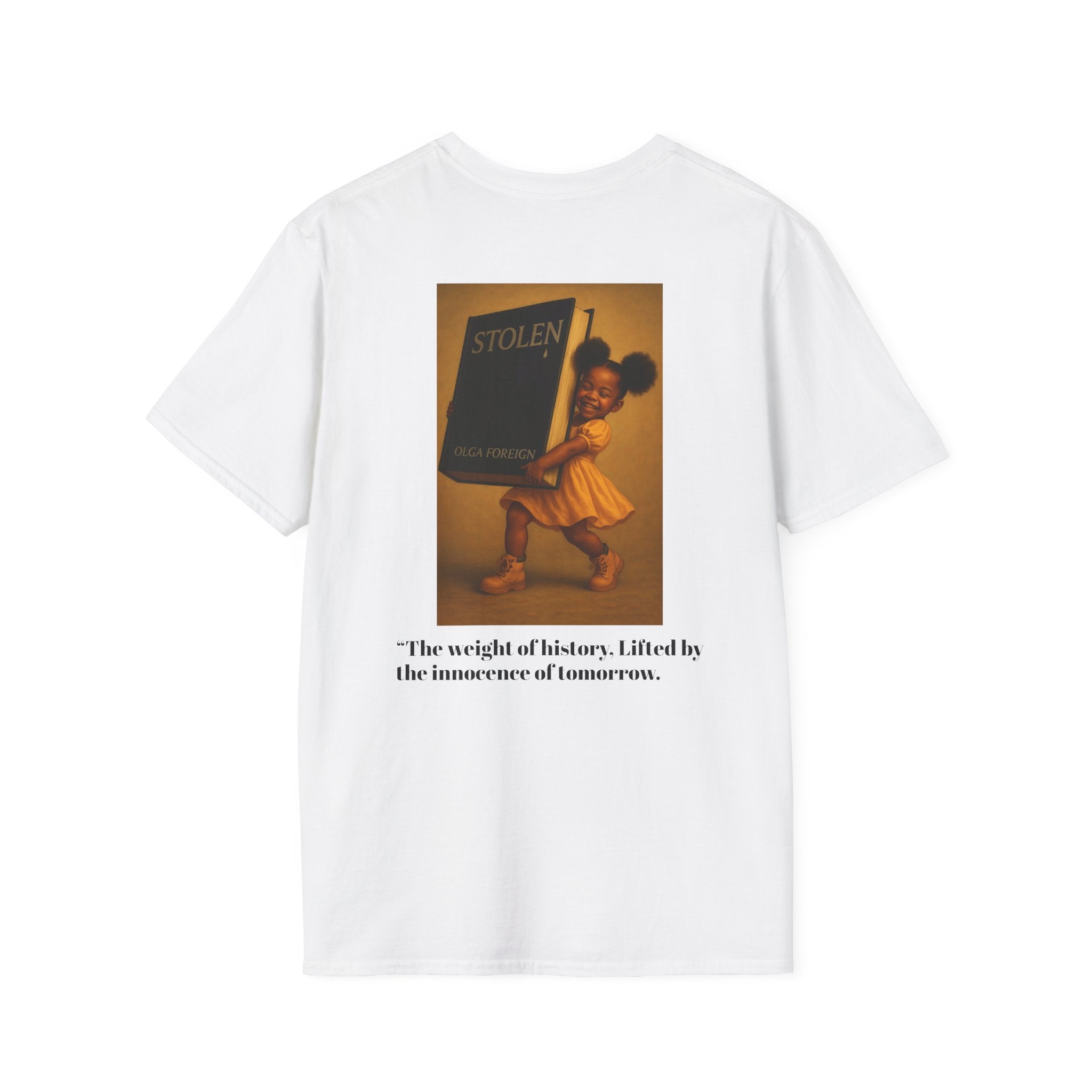A soft and durable T-Shirt featuring an Original Olga Foreign design of a little girl in a yellow dress carrying a huge copy of Olga Foreign's Book Stolen with a big smile on her face. Perfect for casual wear and book lovers. Suitable for adults and made with high-quality materials for long-lasting comfort. Ideal for gifting on birthdays, holidays, or any occasion.